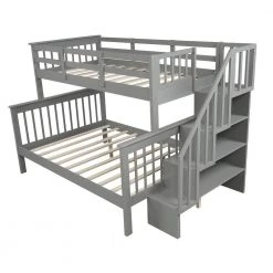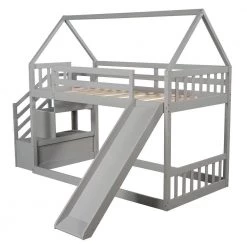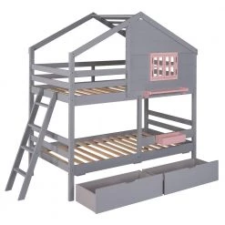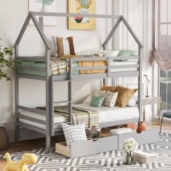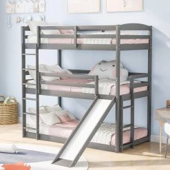 Grey Twin Bunk Beds with Trundle, Solid Wood Trundle Bed Frame with Safety Rail and Ladder by GODEER