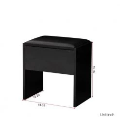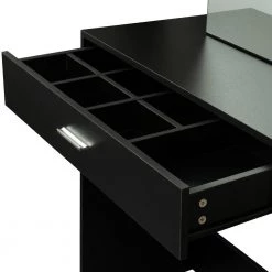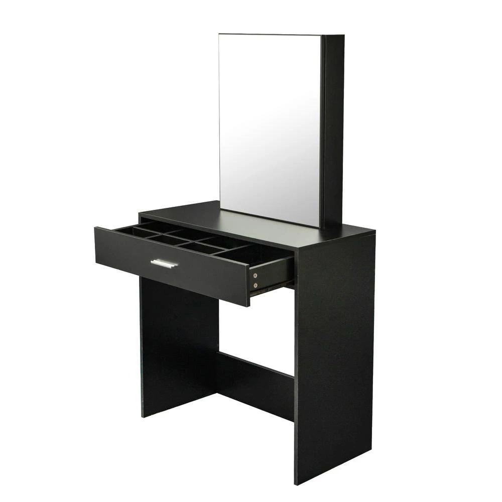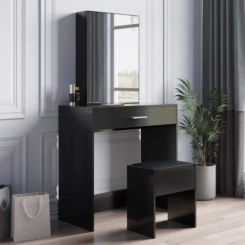 This is a modern dressing table, which brings a sense of fashion to the room. The dresser is equipped with 1 drawer, which can be used to store personal belongings. Behind the mirror is a sliding door hidden cabinet with two shelves inside. And equipped with a stool.