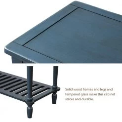 - Solid wood frames and legs and tempered glass make this cabinet stable and durable.