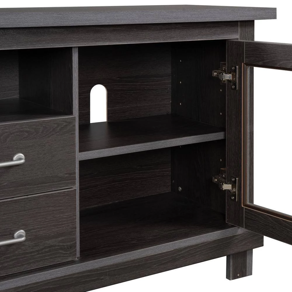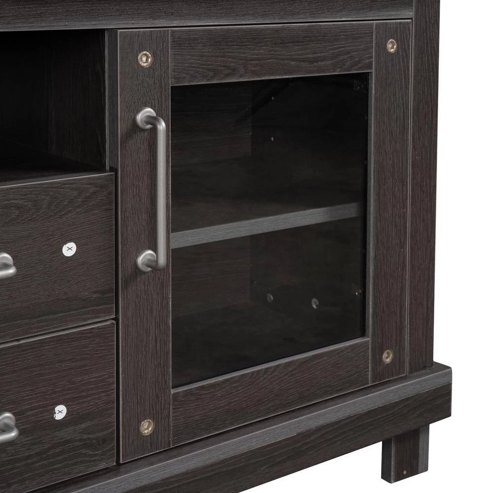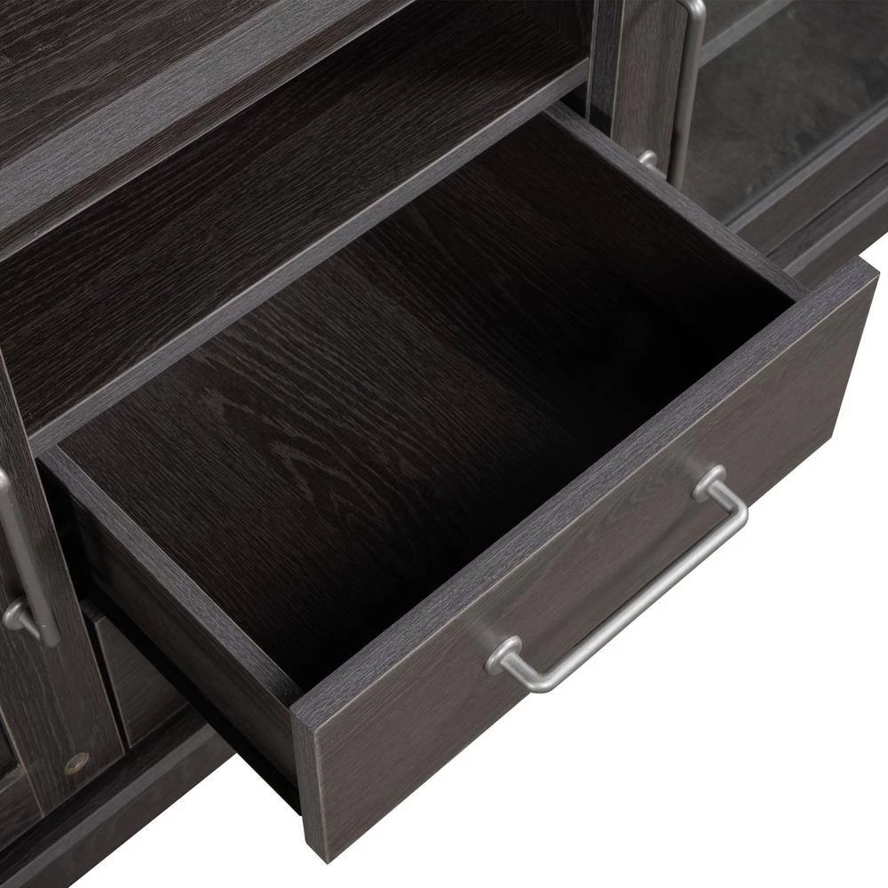 - Such a contemporary and practical design TV stand must have high grade detail to become a competitive product in market, the handles for two drawers are made of antique silver metal, they are looked simple and elegant and comfortable to touch as well. sliding rails is the accessory of sliding drawers are made of metal to guarantee smooth using experience and the long-term duration, the adjustable shelf is particle board with bearing devices on both sides to ensure the sufficient load-bearing capacity