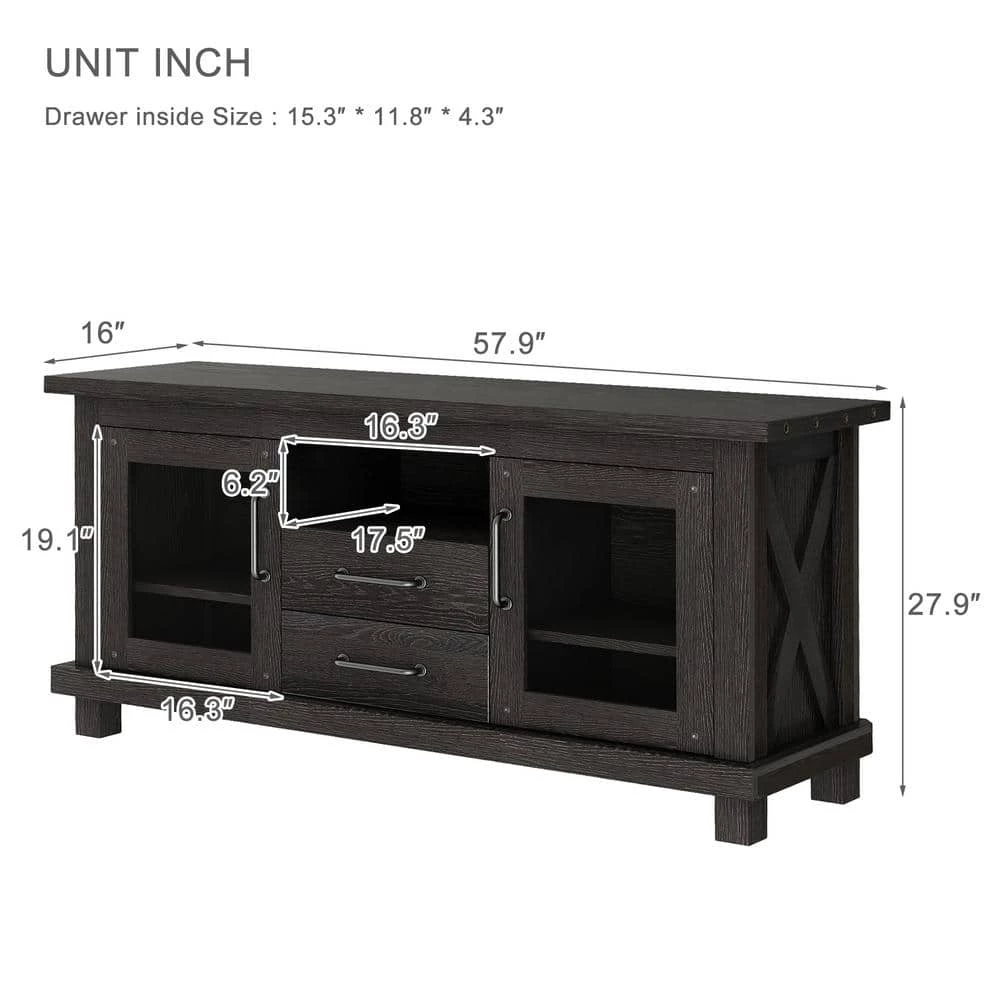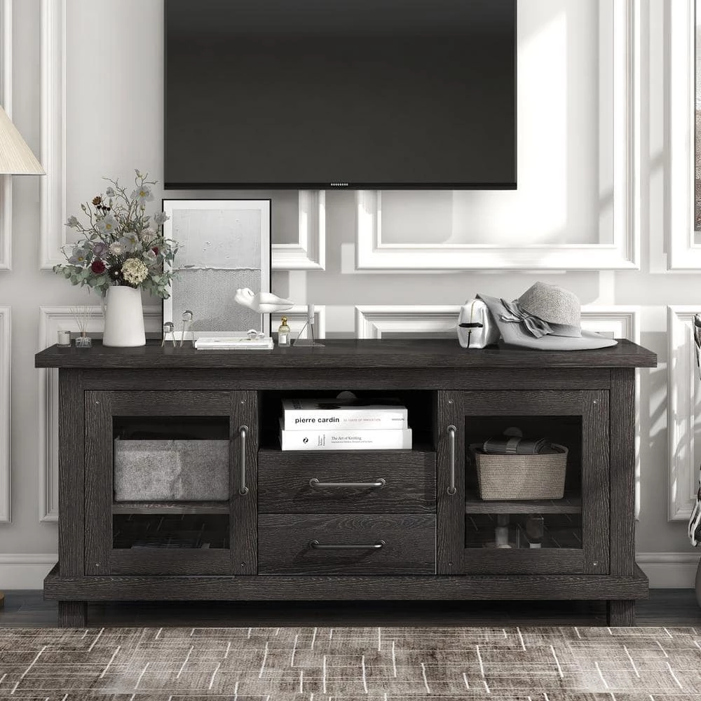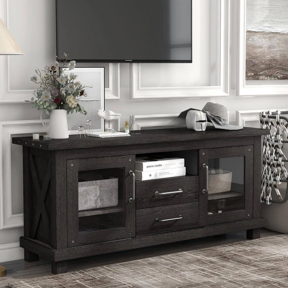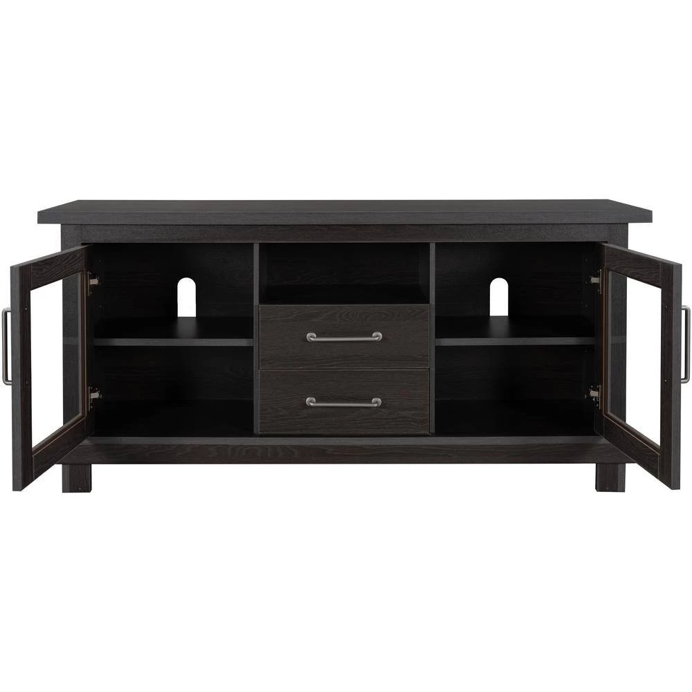 - Such a contemporary and practical design TV stand must have high grade detail to become a competitive product in market, the handles for two drawers are made of antique silver metal, they are looked simple and elegant and comfortable to touch as well. sliding rails is the accessory of sliding drawers are made of metal to guarantee smooth using experience and the long-term duration, the adjustable shelf is particle board with bearing devices on both sides to ensure the sufficient load-bearing capacity