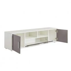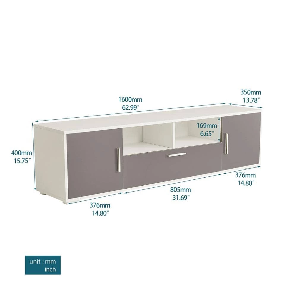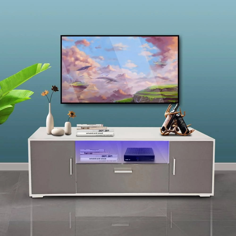 This TV stand with LED comes with 16 RGB LED BACKLIGHT, 4 LIGHT MODE & BRIGHTNESS ADJUSTMENTS. Equipped with REMOTE CONTROL makes changes of light ever easyPERFECT SIZE: 63(L)x 14(W)x 16(H)inch, this white TV console fit up to 65 inch TV. Spacious tabletop along with 3 large storage space satisfies all your display and storage needs in the bedroom or living room
