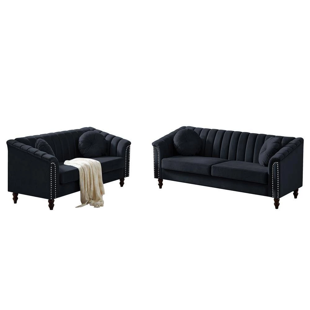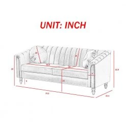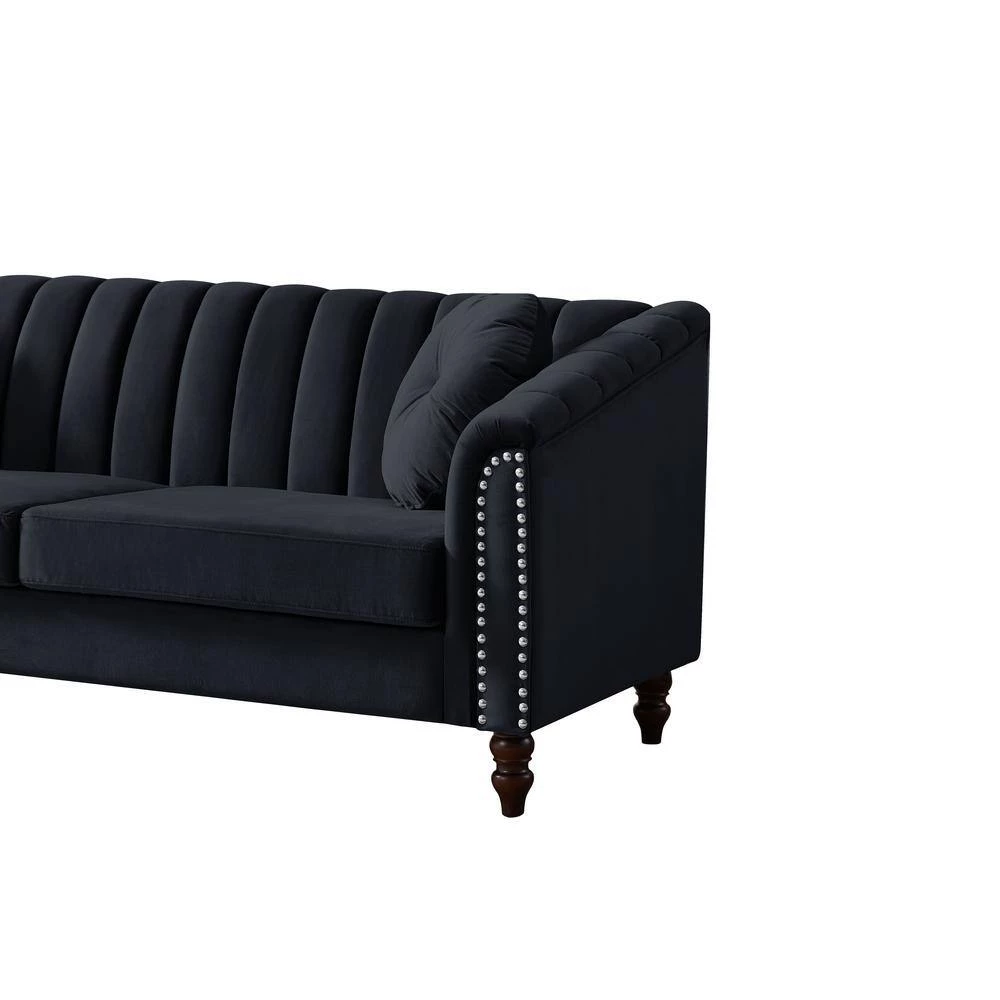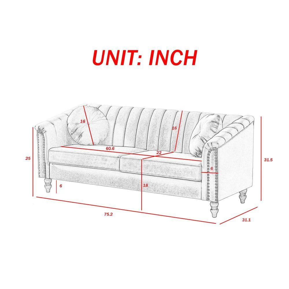 Classic American design, high gram weight super soft velvet. 6- in. High solid wood sofa feet, space for floor sweeping robots to pass freely. Super soft sponge, soft sitting feeling, including 2-round throw pillows with pull buckle in the same color.