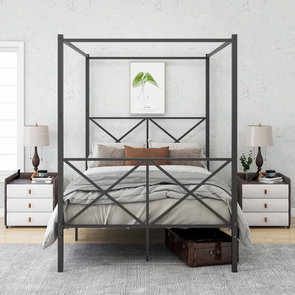 - Platform metal bed with no need for box spring provides valuable under-bed storage. Stylish appearance with vintage headboard and footboard