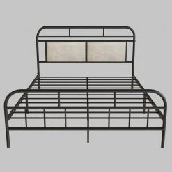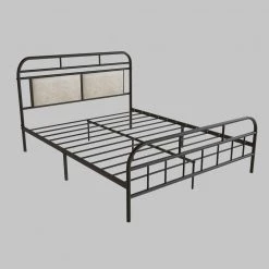 For lovers of convenience and clean-cut style, this elegant Metal Platform Bed is a piece that checks all the boxes. This functional metal frame makes a seamless addition to any space, with its bold black metal, simple lines and foolproof assembly system that makes setup an absolute breeze. The beige upholstered headboard lends a touch of softness to the steel bed frame, and gives your bedroom a more personal feel. In fact, the entire thing comes together without any nuts or bolts in less than 30 minutes. And after pulling it off in record time, you’re left with a bed that’s sturdily engineered to support your mattress on top of its wood platform without a box spring. And if all that weren’t enough, you can also use this ingenious frame to store more under the bed than ever before with its 11.8 in. of clearance space. This Steel Platform Bed Frame with Headboard is the perfect solution for the modern minimalists.