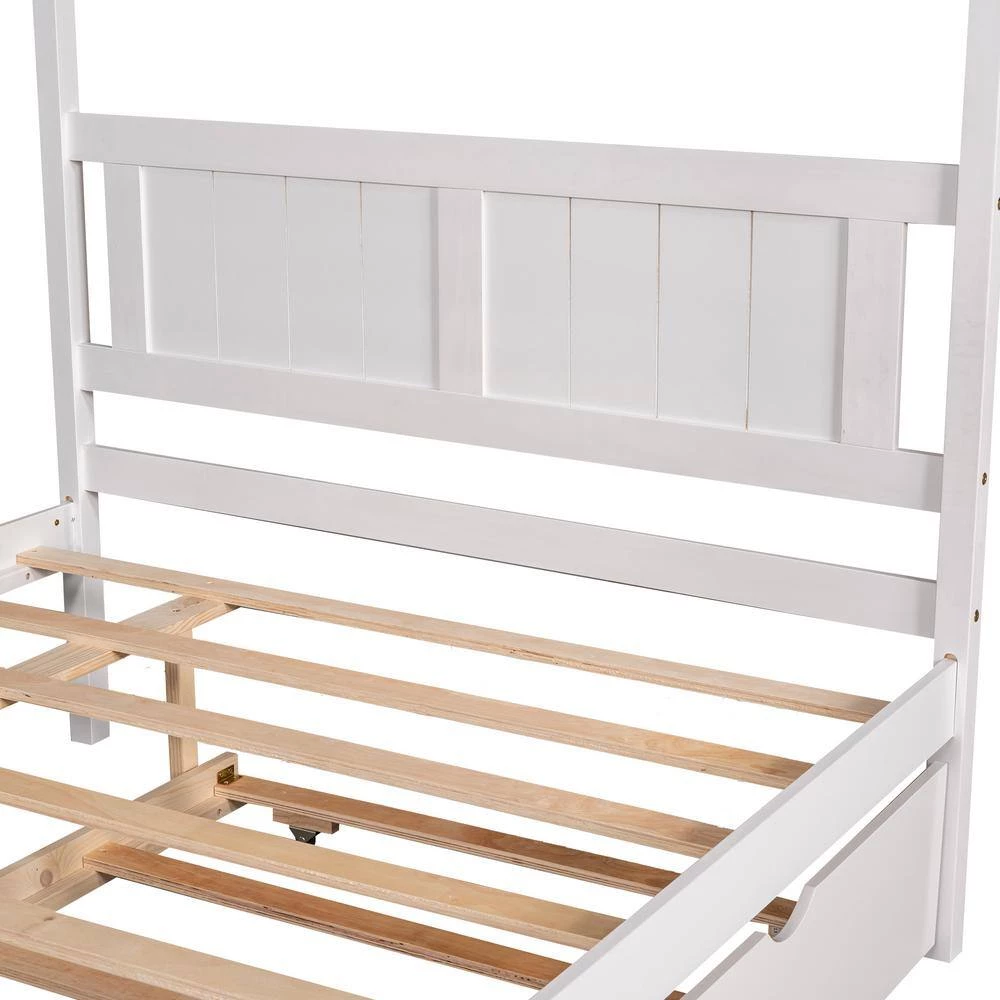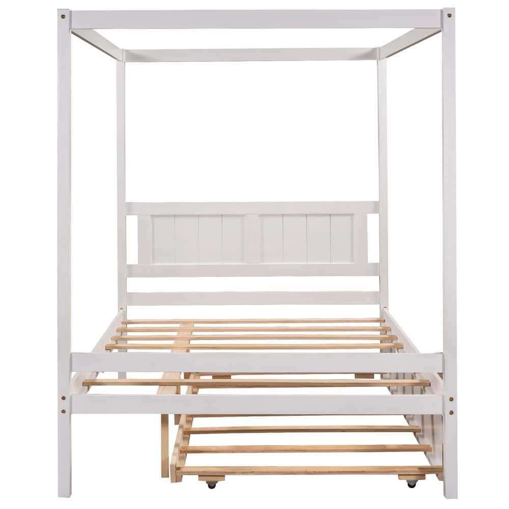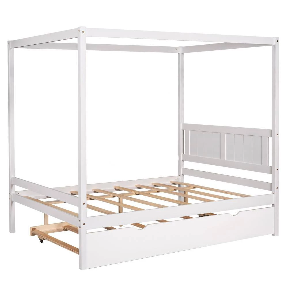 The canopy platform bed with trundle is an eye-catching piece with a modern design that will make perfect centerpiece for your bedroom. With trundle, it is crafted with a sturdy pine wood and MDF construction. It includes secured wooden slats without needing a box spring. The Canopy includes 8 slats and 3 center support legs for added support and comfort. There are full-length rails on the top of the bed, which can be customized with decorative curtains.