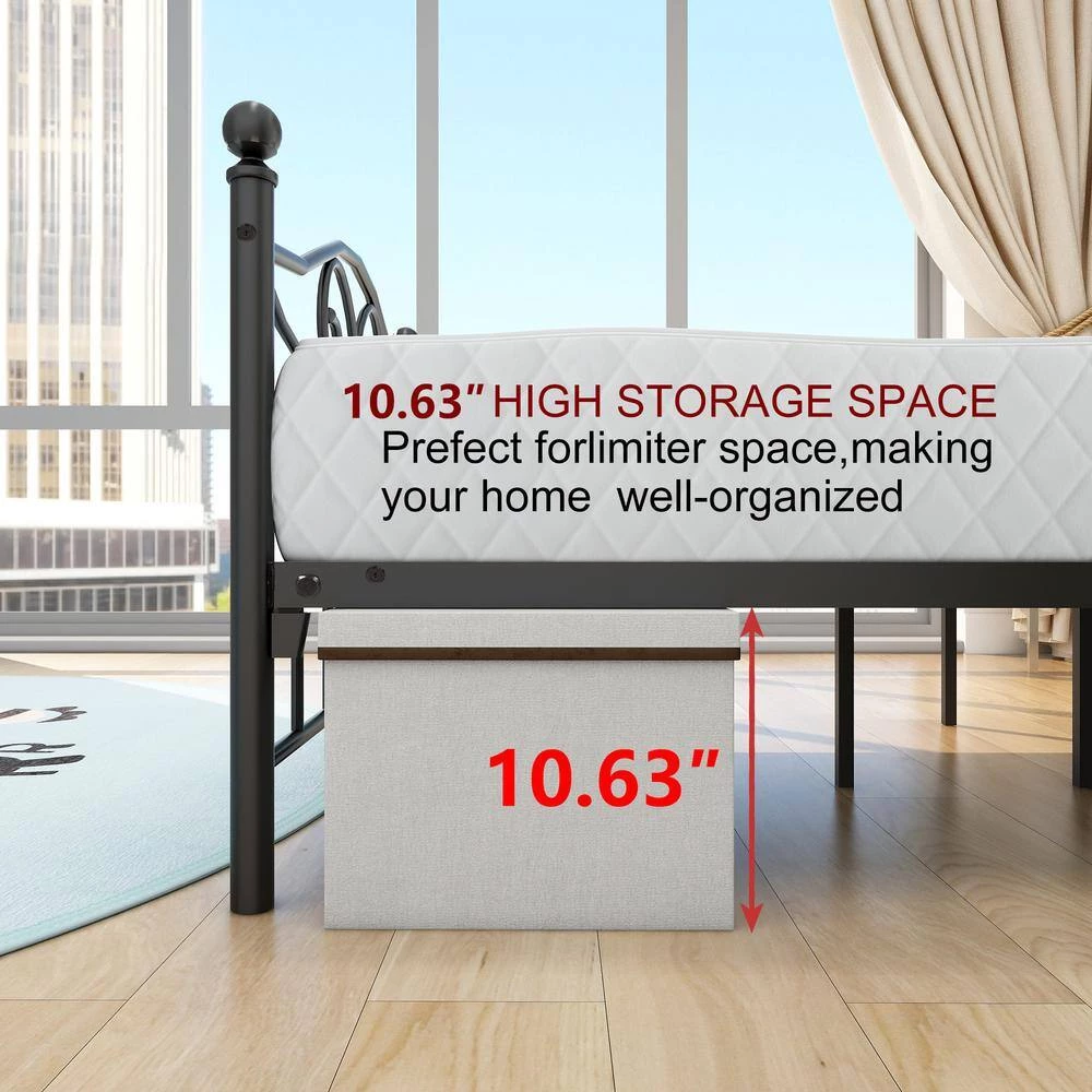- Space Saving Metal Bed: Bed frame equipped with 10.63″ under bed space, no box spring needed. Providing ample storage space for your personal belongings such as storage boxes, suitcases, trunks, etc. Super easy assemble
