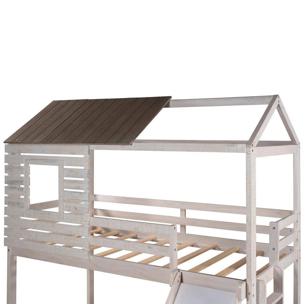 Add a dash of creativity to your bedroom with this house-shaped twin over twin bunk bed. Designed with a neutral color pallet of antique white and antique gray, this bunk is gender neutral and suitable for different people. Crafted with pine wood, plywood and MDF board, this bunk bed is manufactured for sound stability and security that can withstand playing without dangerous wobbling with a high weight capacity. The included two drawers provide a perfect storage solution for you, while the whole bed just takes up minimal space. The full-length guardrails for upper bed ensure safety for you. Meet the need of sleep and play at the same time, this bunk bed with slide will become a popular unit in your bedroom.