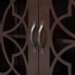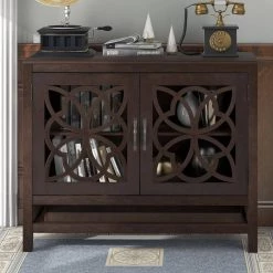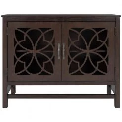 Highlight your home with this decorative accent cabinet, the fretwork doors add for an elegant design that is attractive and eye-catching. Made of solid pine wood for top and high-grade MDF for framework and legs, the storage cabinet is built for long-lasting construction. With brown painted finish, the accent cabinet features a simple yet charming look. The shelf is adjustable to store your favorite decor and accessories. Certified by dry wood standards, the quality of this cabinet is ensured for safety and performance. This combination of practical and ornamental design create a beautiful accent console cabinet that will complement any living room, dining room or hallway.