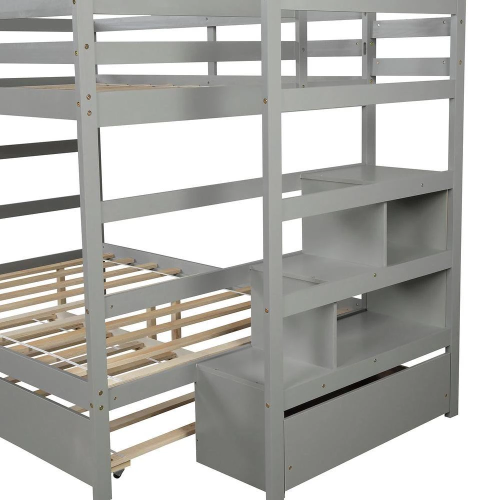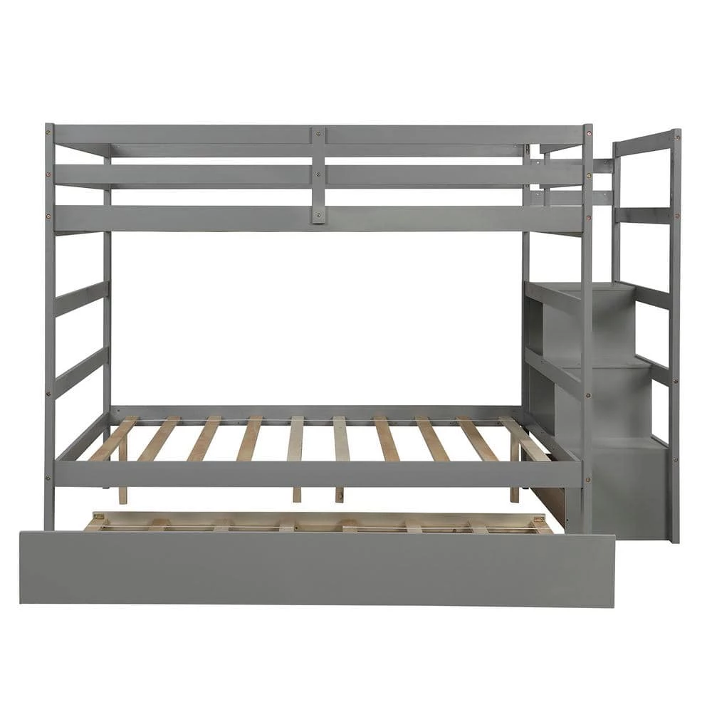 If you need extra sleeping space or your family love sleepovers, this Stairway Full-Over-Full Bunk Bed with Twin size Trundle and Drawer is perfect for your home. Two open shelves located beneath the attached staircase and one drawer provide ample storage for your family’ toys and bedding. High-quality, solid pine legs and a strong, durable frame ensures stability and durability for long-term use. Slat kit included so box springs are not required. This bunk bed is designed with a clean silhouette and a hue of elegance. It suits all styles of home decoration, and completes the look of any bedroom.