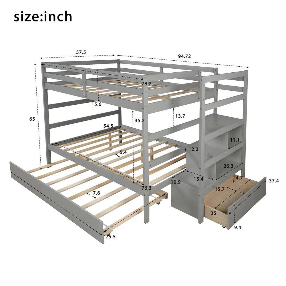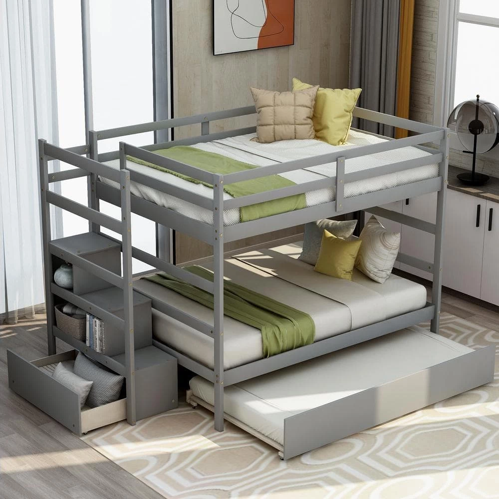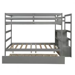 - [Versatility galore] This bunk bed features two full size bed and a twin size trundle for accommodating your family or any overnight sleepers. Slat distance: 5.4″. No spring box needed.