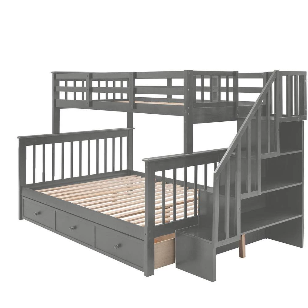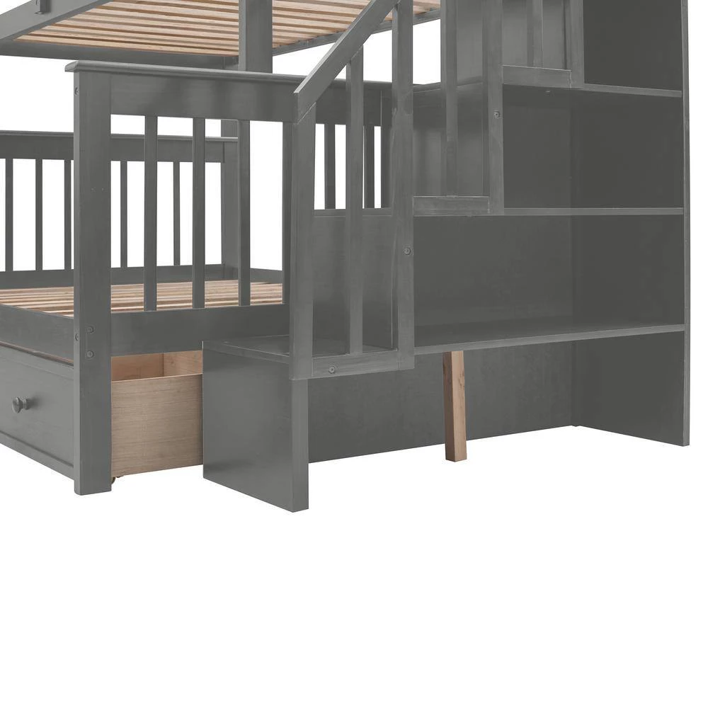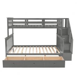 If you need extra sleeping space or your family love sleepovers, this Stairway Twin-Over-Full Bunk Bed with Drawer is perfect for your home. Four open shelves located beneath the attached staircase provide ample storage for your family’ toys and bedding. High-quality, solid pine legs and a strong, durable frame ensures stability and durability for long-term use, and can be separated into one twin,one full-size bed. Slat kit included so box springs are not required. This bunk bed is designed with a clean silhouette and a hue of elegance. It suits all styles of home decoration, and completes the look of any bedroom.