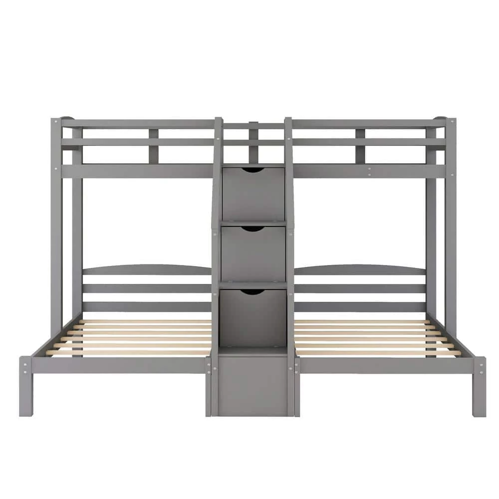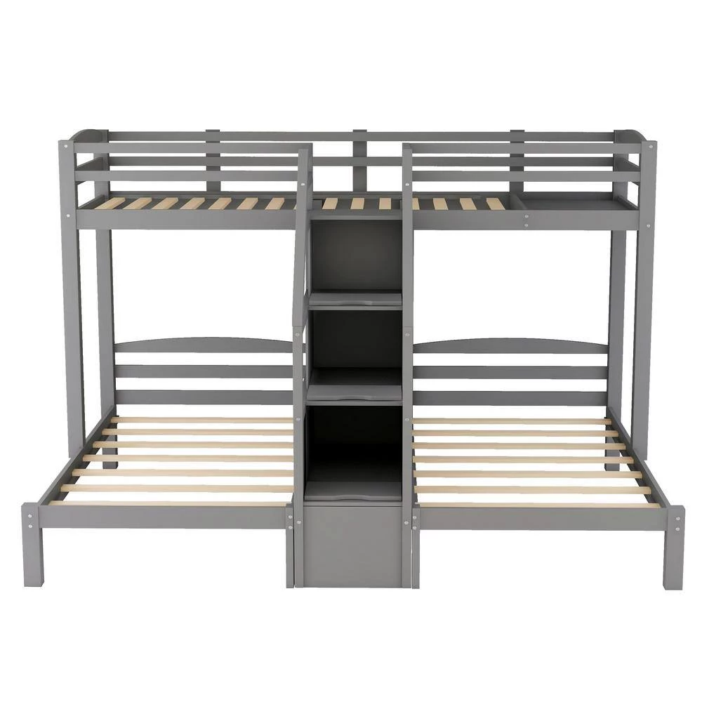 This bunk bed is a real space saver by combining three beds into one. With an upper twin-size bed and two twin beds down, this bed is perfect for guests and overnight stays, as well as for families with multiple members. The built-in staircase between the two beds can be used for storage,and there is also a little drawer between the down two beds for strong daily necessities such as phones or bottles.This bed is of high quality and versatility, making it the perfect addition to your bedroom.