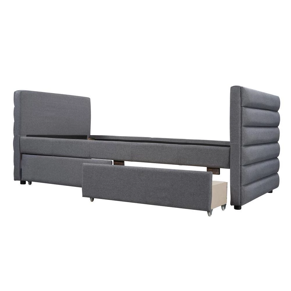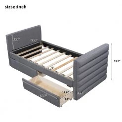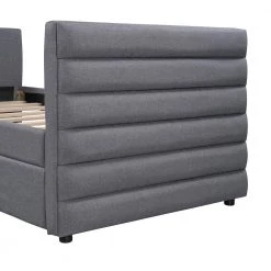 Give yourself a well deserved lounging session in our Upholstered Daybed, perfect for sitting on as a sofa and sleeping. Designed with compact spaces in mind, this daybed might be just the answer you have been looking for with its small footprint featuring two drawer with built in base smooth glide wheels. Crafted with quality sourced materials, this day bed’s frame is manufactured with solid pine wood for heightened durability and matching built-in MDF slats to support the twin sized mattresses for solid support you can rely on.