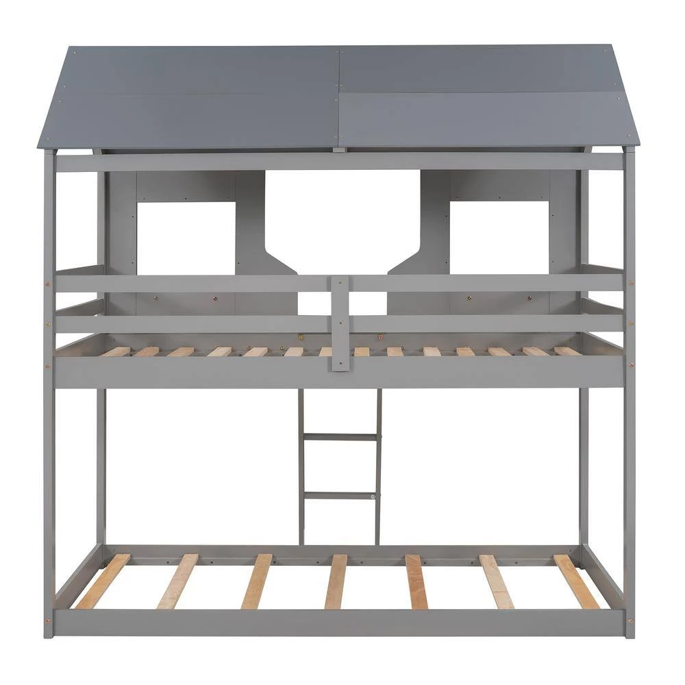 Take your bedroom to the next level with this twin over twin bunk bed that not only saves space, but creates an exciting atmosphere for you. Featuring a pitched roof and playhouse-inspired wall with window, this bunk bed doubles as a semi-enclosed play place perfect for you to study, watch TV or explore their imaginations. With guardrails, a ladder and a sturdy pine frame, this bunk bed offers a safe space for you to get a good night’s sleep.