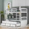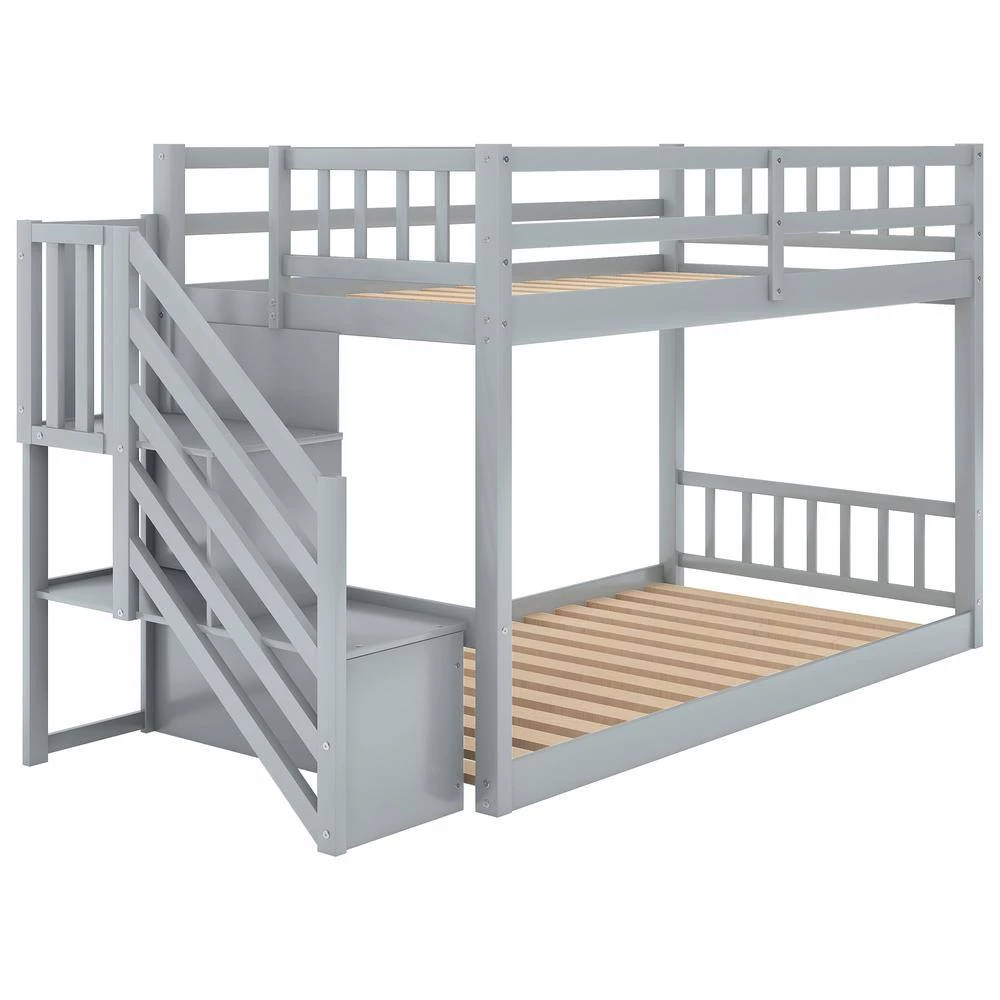 This bunk bed is a good gift for you. When it’s time to move out of the nursery and into big kid-sized furniture, this twin-over-twin bunk bed is just what your room needs. Measuring just 50.6” H, this low-profile design is great for smaller rooms, opening up lots of floor space for play. There’s also a staircase with banisters for easy access to the top bunk. This bunk bed takes up minimal space and provides sleeping room for two. Made of solid pine wood in a beautiful painted finish for a traditional and transitional style to coordinate with any style. Including two side ladders and guardrails on the top bunk for safety. The ladder also with storage, can store some idle item. Assembly required.