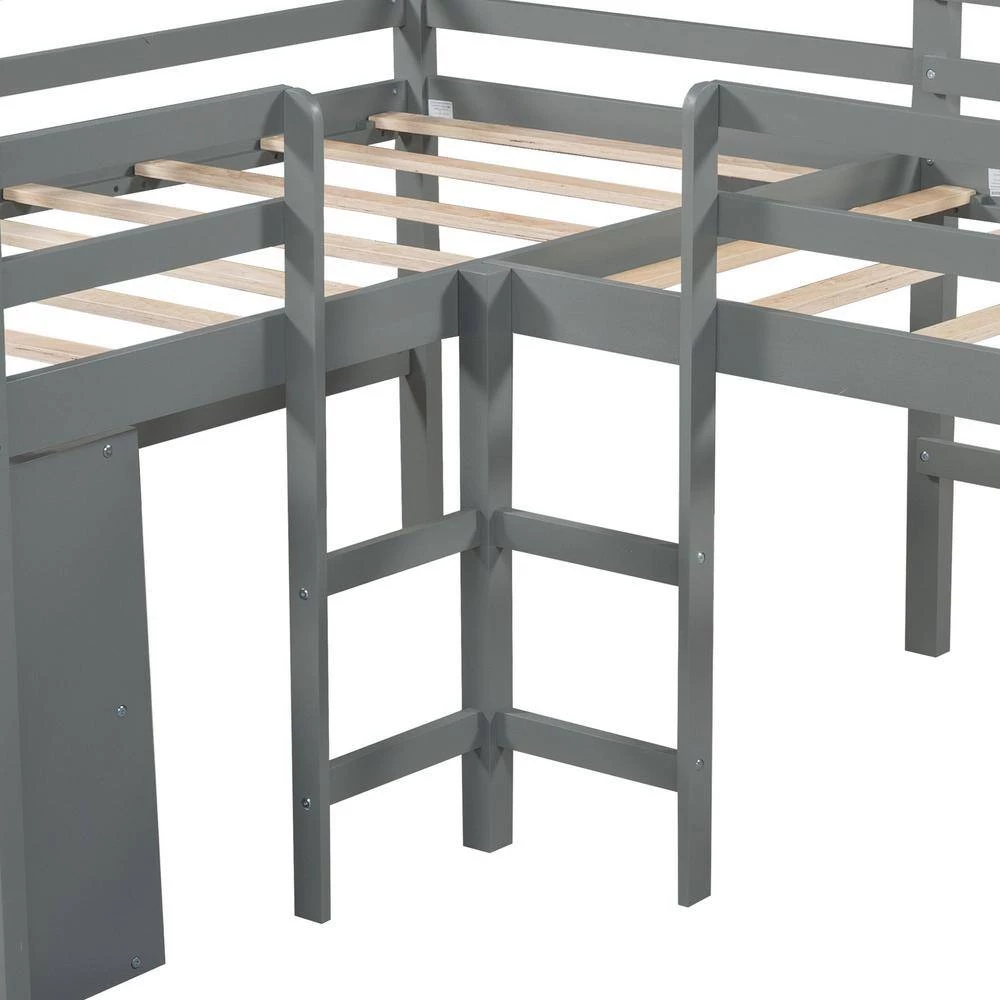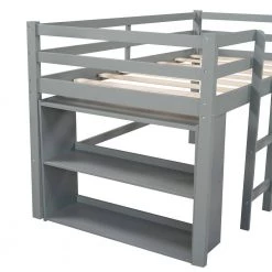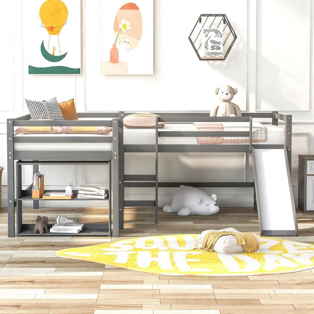 This is a versatile, mission style L-Shaped bed. Constructed of pine these beds are both stylish and durable. These beds are perfect for your family, sleepovers or your extra guest sleeping at your lake house getaway. High-quality, solid pine legs and a strong, durable frame ensures stability and durability for long-term use. Slat kit included so box springs are not required. This L-shaped loft bed with shelves is designed with a clean silhouette and a hue of elegance. It suits all styles of home decoration, and completes the look of any bedroom.