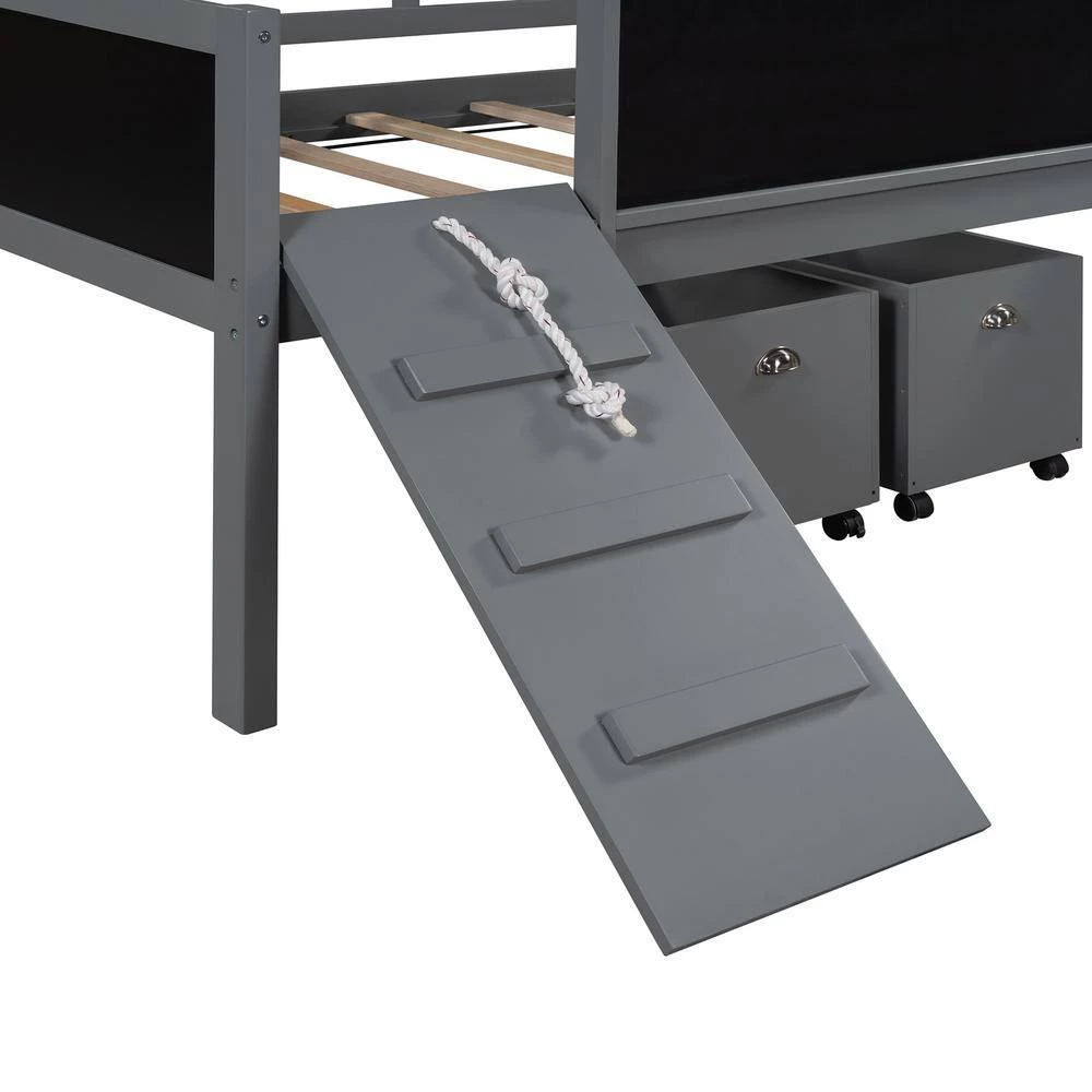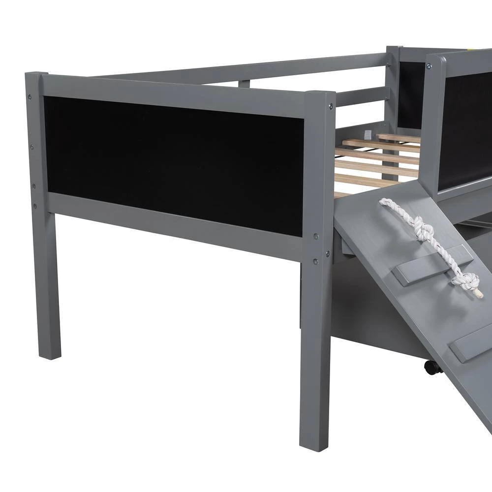 A novel idea be put into design when manufacturing this marvelous loft bed, a ladder be exchanged to a climbing frame which appealed to most people much more. And the way to get out of bed is sliding. This interesting design loft bed offer the chance to train your physical coordination in daily life and push them gain more happiness in bedroom. The double-sided chalkboard set on 3-sides allow you use your imagination and creativity at any time, and stimulate the potential of your brain. Additional storage boxes is another shining idea in design as they are great useful and helpful tools for parents. The open design storage boxes are the perfect space to store all sorts of toys and daily necessities. Four classic colors make you can choose your favorite color freely.