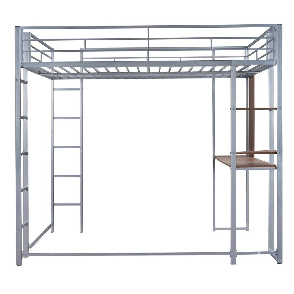 - Space-saving solution loft bed includes a desk and two shelves integrated to metal frame and has 58.3 in. of under-bed clearance