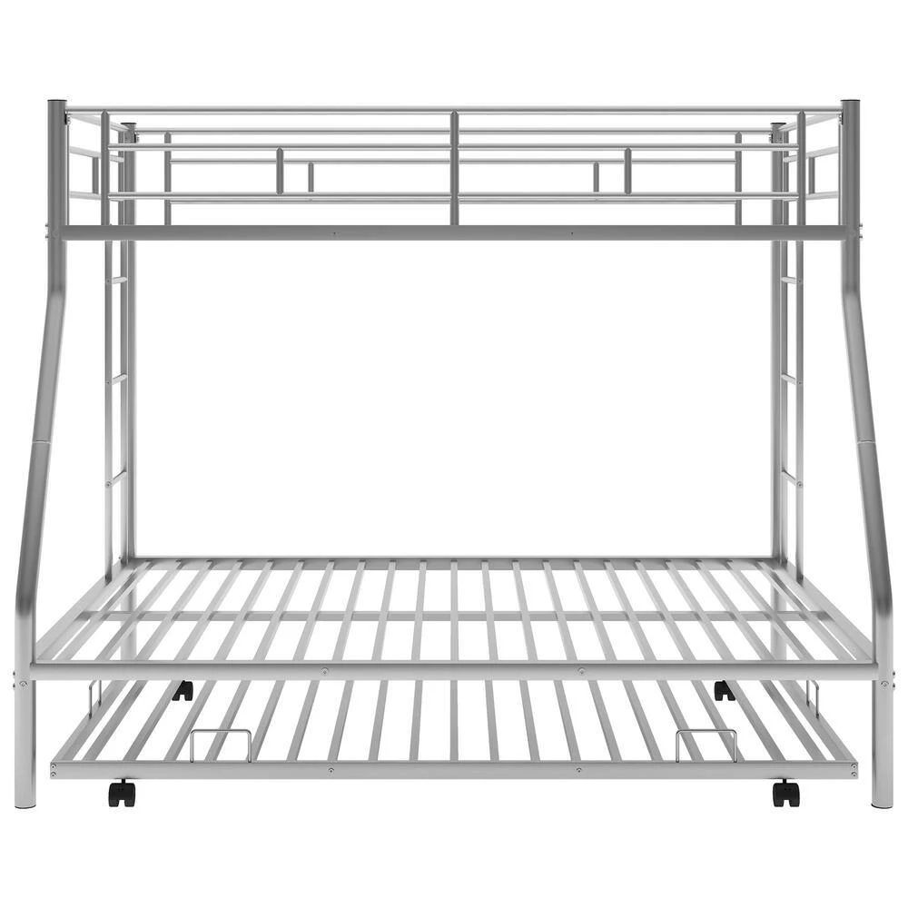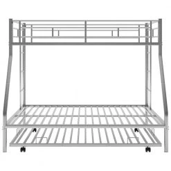 This metal bunk bed is made of high-quality steel which ensures long-lasting use. The full-length guardrails keep you safe from falling, bringing you full sense of security. For added convenience, the bunk bed comes with ladders on both side and the wheels attached to trundle can be locked, so the trundle can keep stable when you’re using it. Featuring two twin size beds and one full size bed, this bunk bed offers you multiple choices. All accessories are available in the package, so you can assemble it in short time following the assembly instruction, perfect for your room.