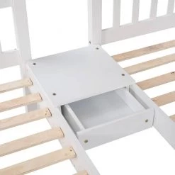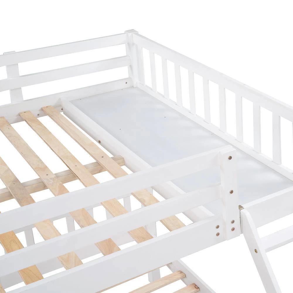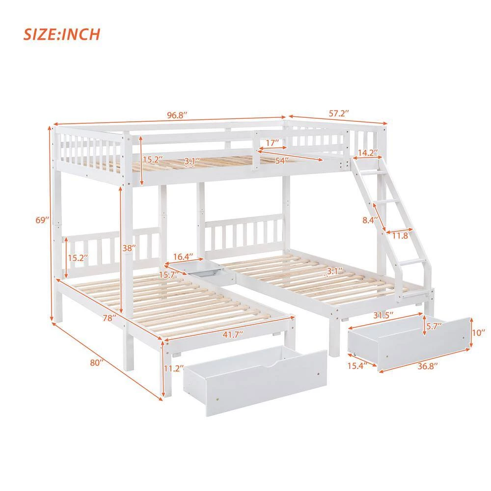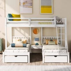 - [Multi-functional] This triple bed can be divided into three separate beds to meet your different needs. The shelf beside the upper full bed and the table with drawer between the two lower beds provide place for you to put some daily supplies within easy reach, and the two pull-out drawers under the lower beds save a space for you to store some clothes and toys.