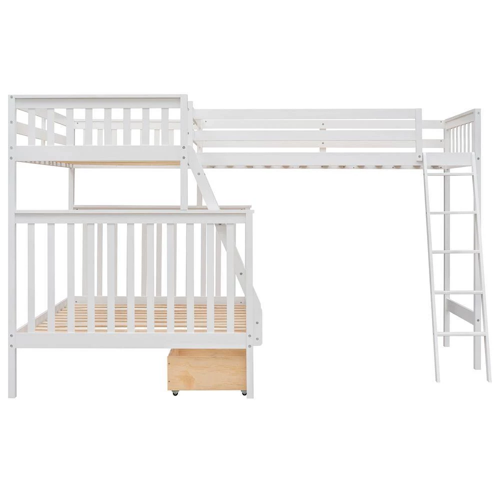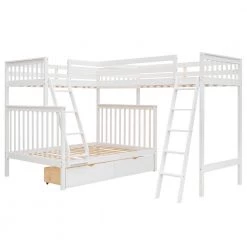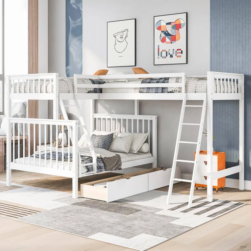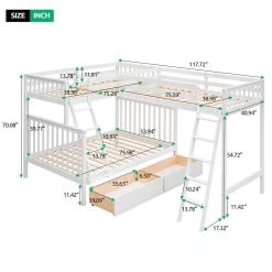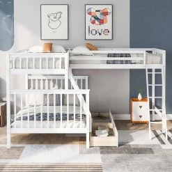 - [Maximized space] Functional and aesthetic, this L-Shaped bunk bed and loft bed will enhance any bedroom. A wonderful bed for 3. Fun for your family, sleepovers or your extra sleeping guests at your lake house getaway.