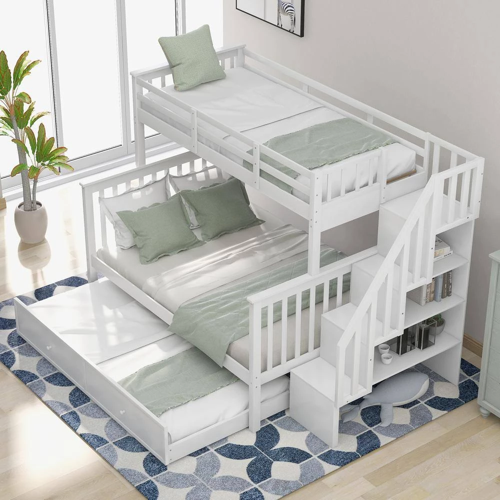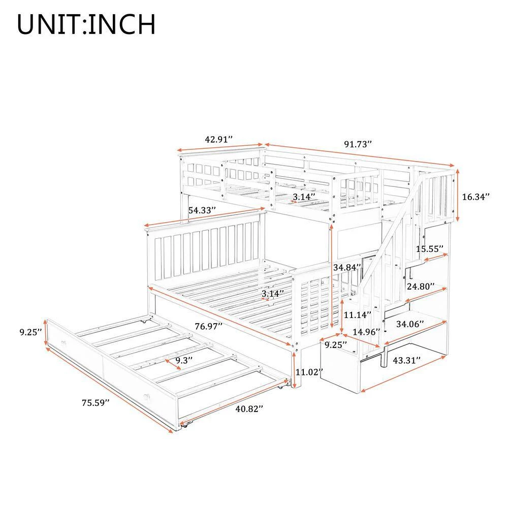 If you need extra sleeping space or your family love sleepovers, this Stairway Twin-Over-Full Bunk Bed with Trundle, Storage is perfect for your home. Four open shelves located beneath the attached staircase provide ample storage for your family’ toys and bedding. High-quality, solid pine legs and a strong, durable frame ensures stability and durability for long-term use, and can be separated into one twin,one full-size bed and a twin size trundle. Slat kit included so box springs are not required. This bunk bed is designed with a clean silhouette and a hue of elegance. It suits all styles of home decoration, and completes the look of any bedroom.