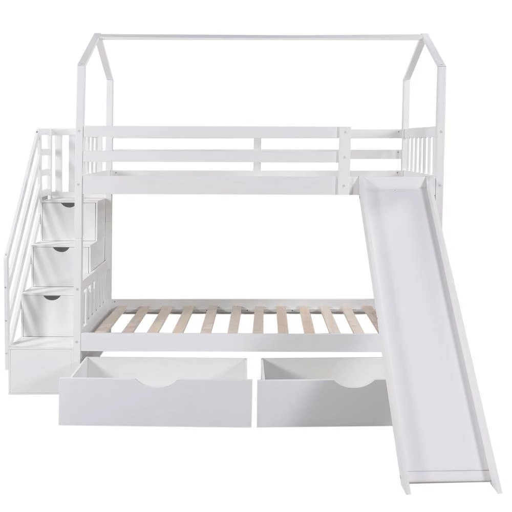 This bunk bed fixes your child’s bedroom in the house design while adding a lot of extra storage space. It is made of solid pine and MDF with a neutral finish of your choice. This bunk bed is equipped with a ladder that allows you to easily climb to the upper bunk. The slide provides you with extra fun, and the two drawers at the bottom of the bed provide you and your space with space to store spare sheets and blankets. The space under the stairs is also a good place for storage.