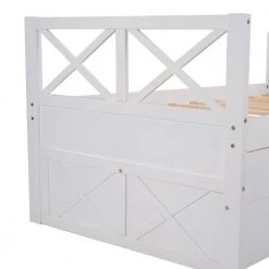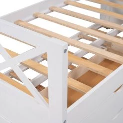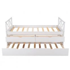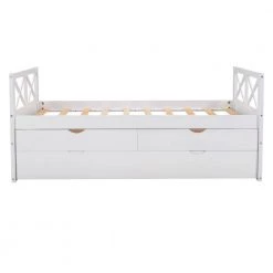 This daybed provides multiple function to meet your various needs. Coming with 2-drawers, the bed provides great storage function to store away your stuff or bedding. There’s a trundle under the drawers which is ideal for accommodating sleepovers or friends, perfect for bedroom or guestroom. Featuring X-frame on side, this bed adds a dose of rustic style to your room, elegant and suitable for any room style. Crafted of solid pine wood and high-quality MDF, the bed provides great support and can serve your family for many years.