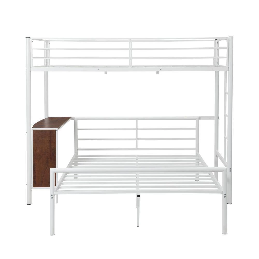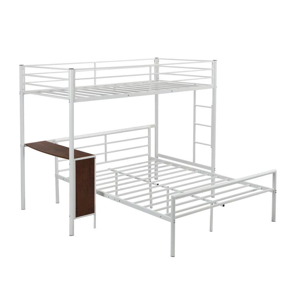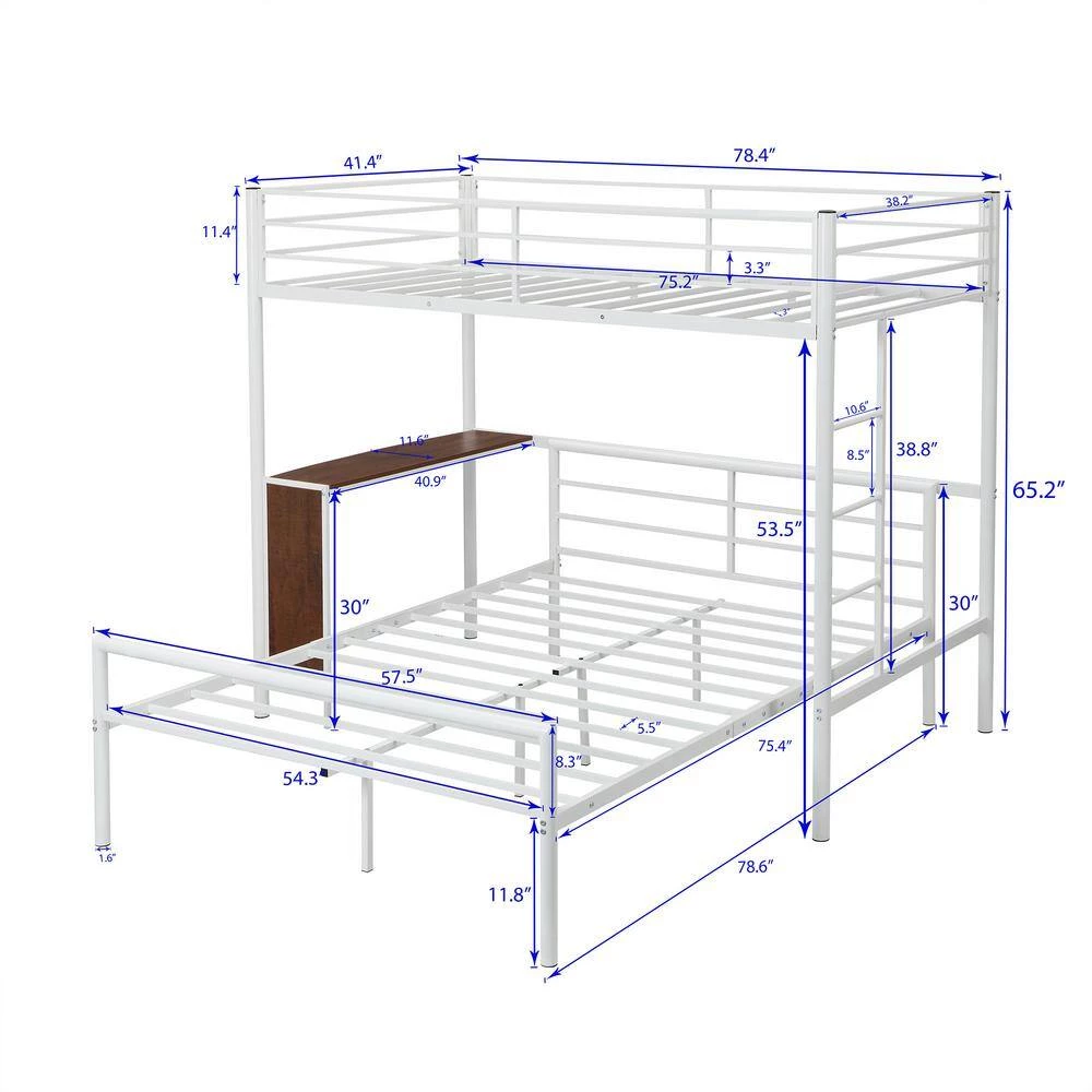 Appealing to this eye, this multi-directional bunk bed is equipped with all of the basics needed to provide a comfortable and fully functional bedroom that will turn your sleeping quarters into an oasis. Crafted with a finished metal frame, the neutral color scheme will seamlessly play in the background of any bedding and decor styles of your choice. Featuring an expansive full sized bed on the bottom and twin sized bed on top facing different directions, this bunk has been formulated to draw the eye and make a bold contemporary statement while also accommodating multiple people. 360-guardrails on the upper bunk and the secure heavy duty bed frame make this bunk a sturdy and safe option for your bedroom, while also featuring a built-in side desk featuring MDF wood desk, making this piece a 2-in-1 furniture addition to your space.