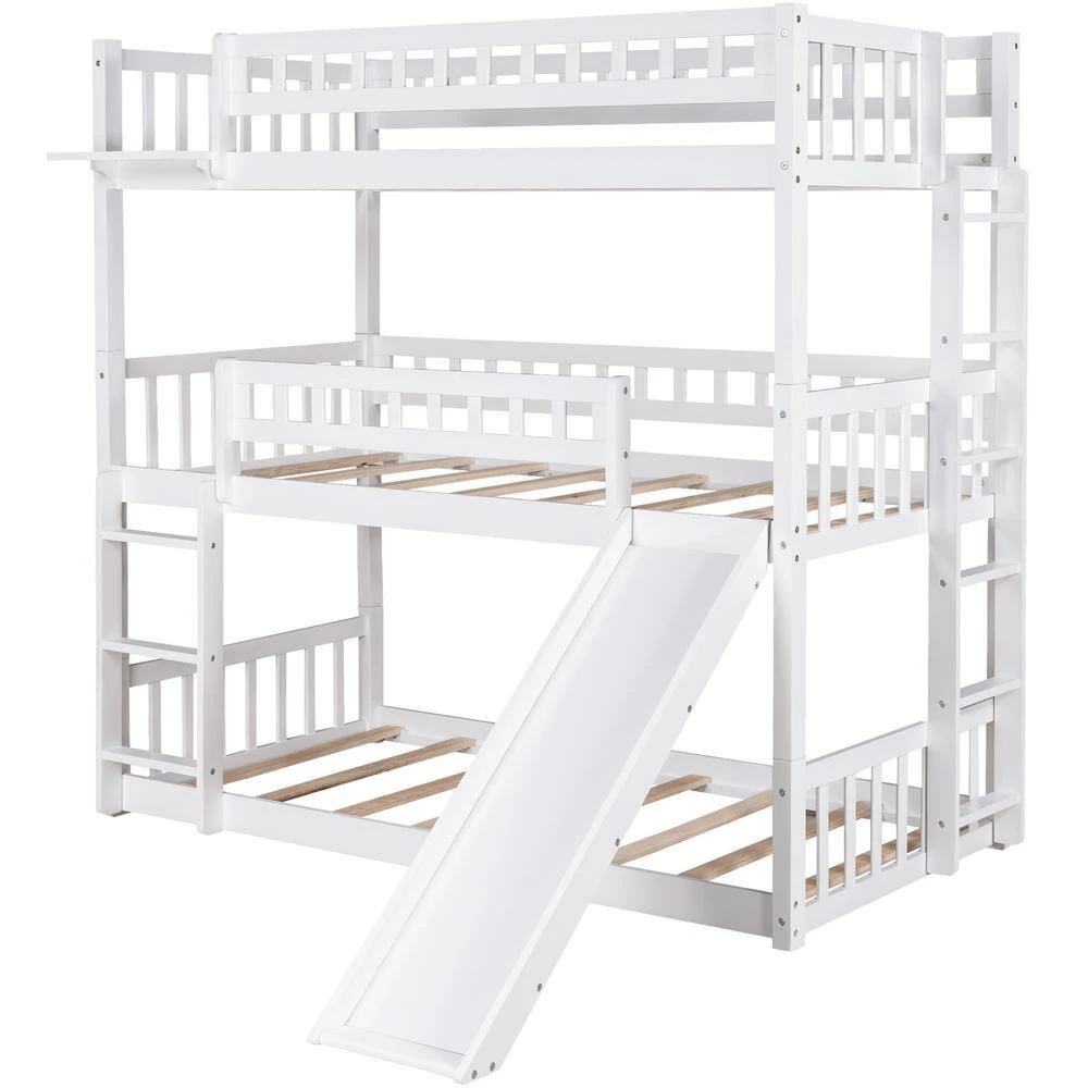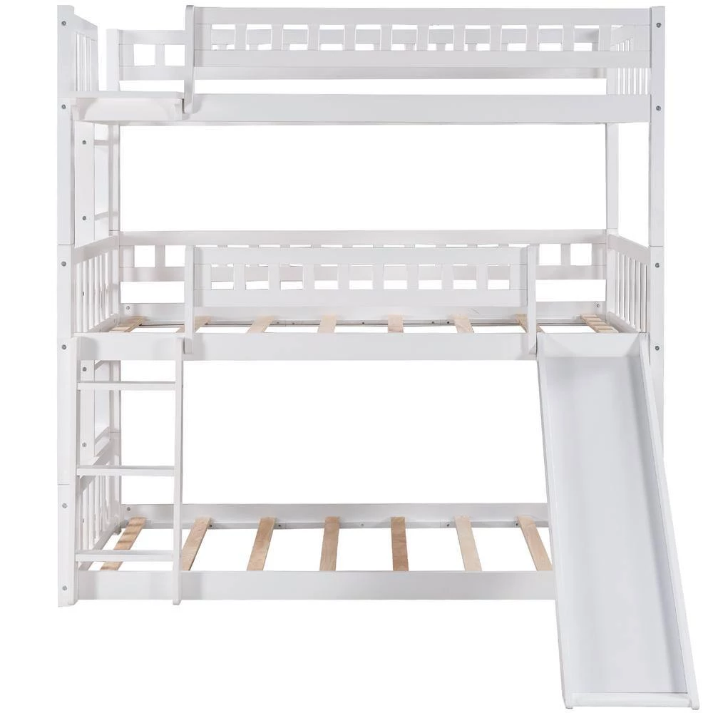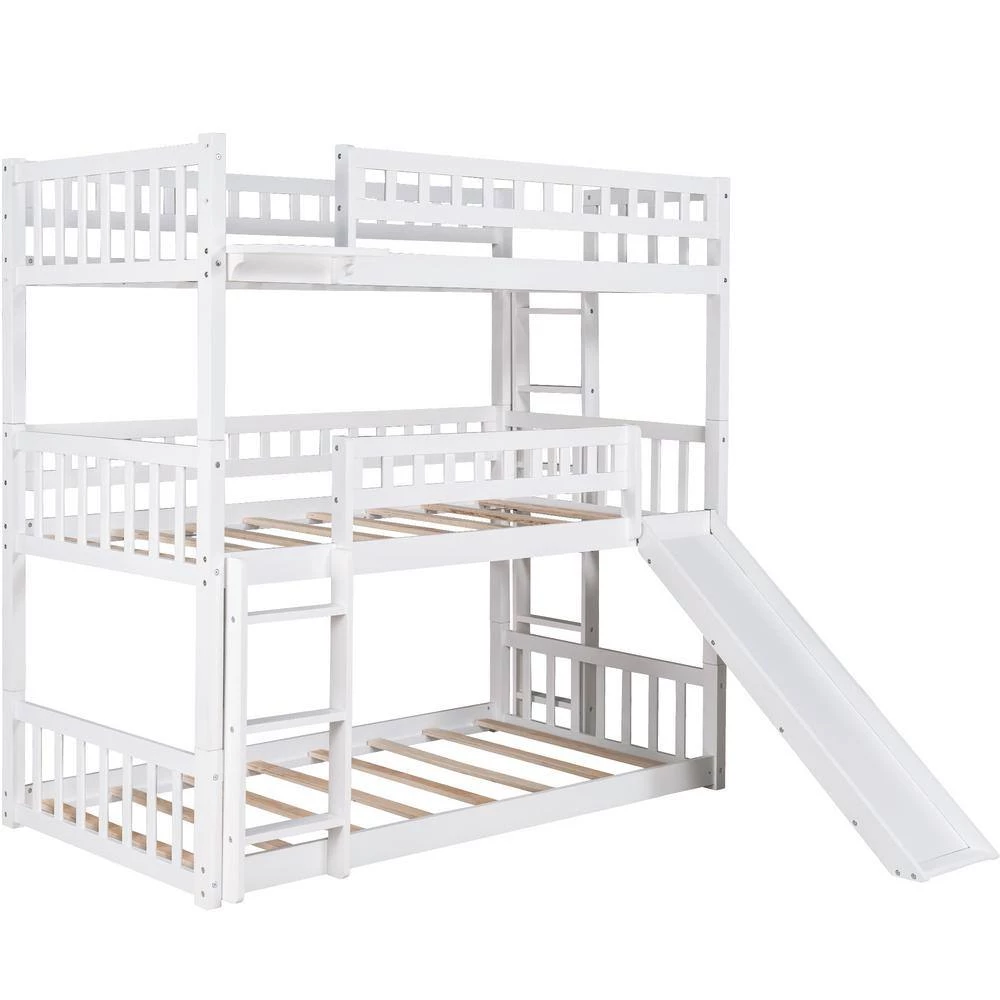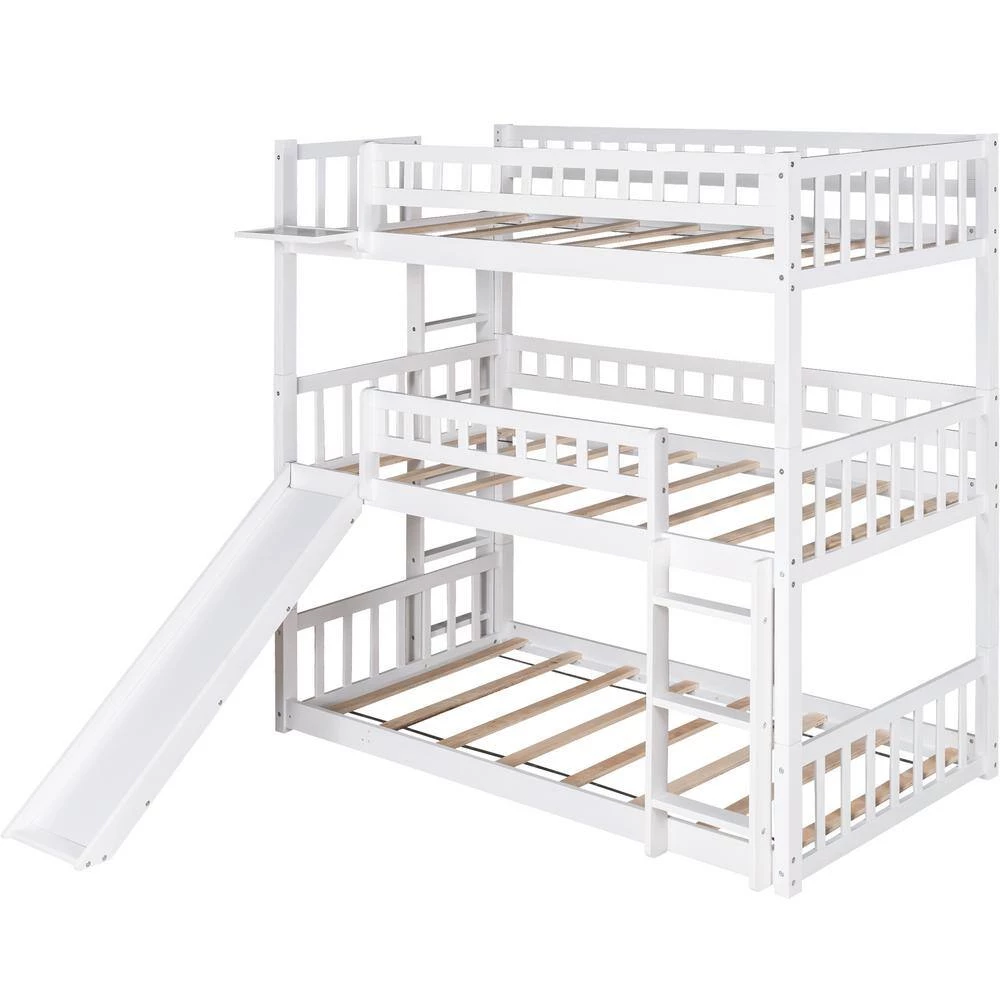 Featuring a twin-over-twin-over-twin structure, this triple bed provides a convenient and flexible arrangement option for large families and sleepovers by taking advantage of vertical space. A gray finish enhances the smooth lines and add a contemporary feel to any room set aside for multiples to sleep. Crafted with pine wood and plywood, this triple bed is sturdy and durable to withstand the test of time. You can easily access the upper and middle bunks with 2-built-in ladders. Sturdy guardrails protect you as they sleep through the night. The specially designed slide can meet the play needs of you and develop their balance ability. This set works perfectly as a stacked twin-over-twin-over-twin unit, or divided into 3-separate twin beds. You can choose the combination method based on your own needs.