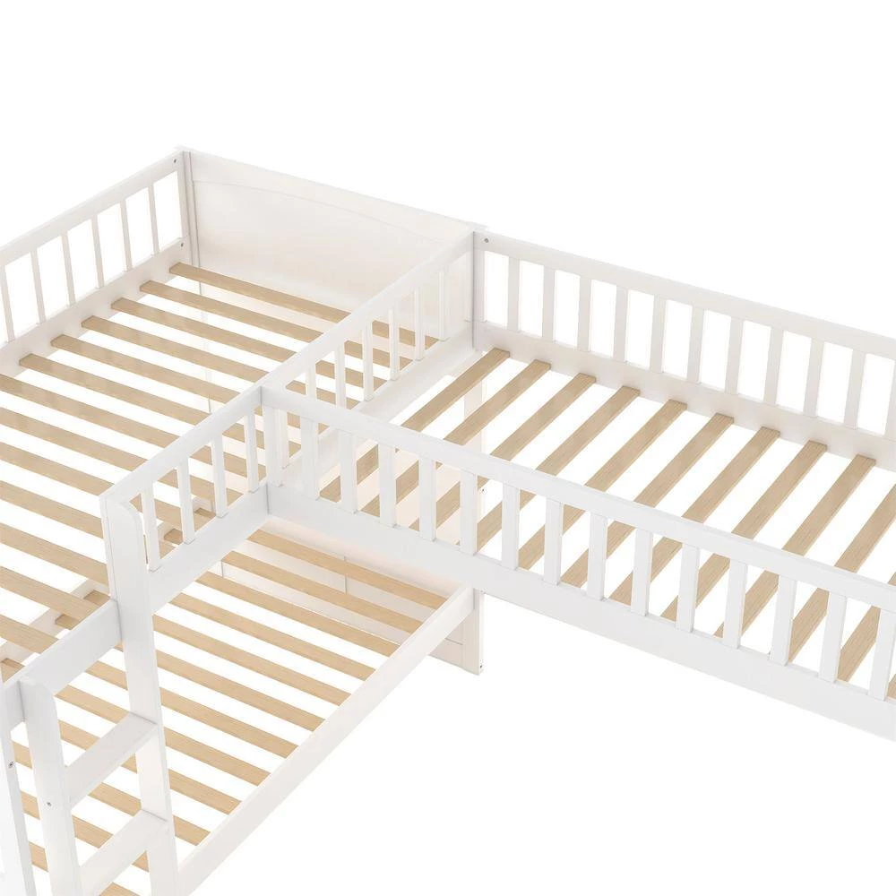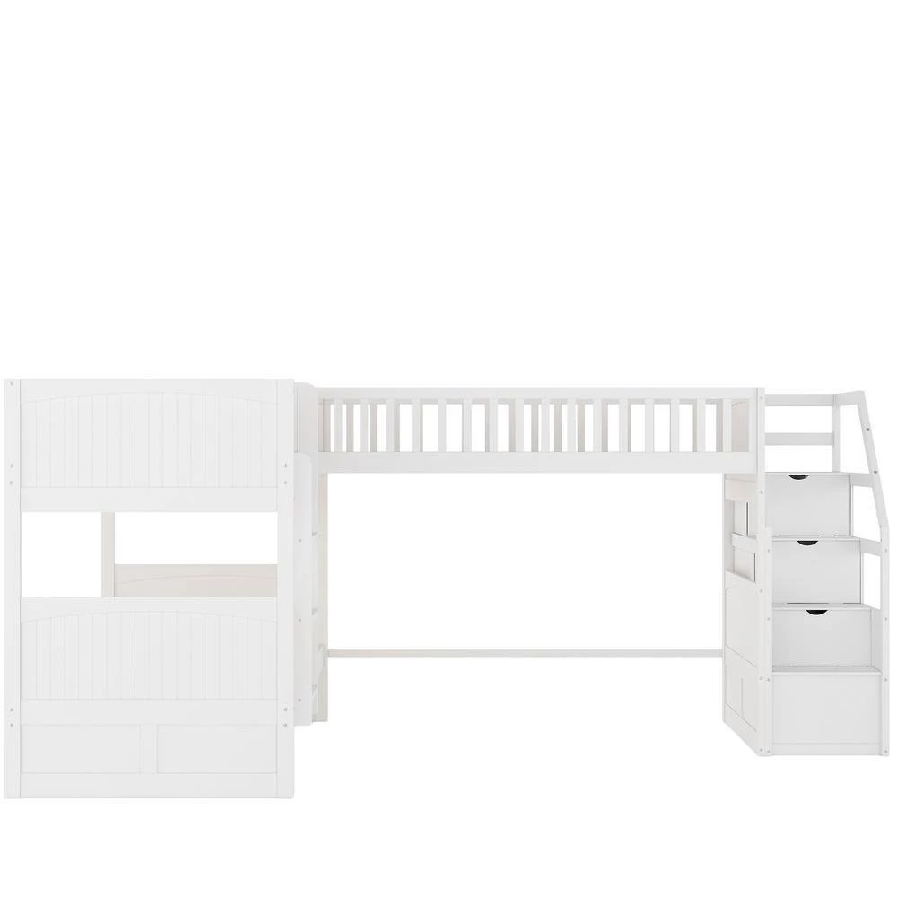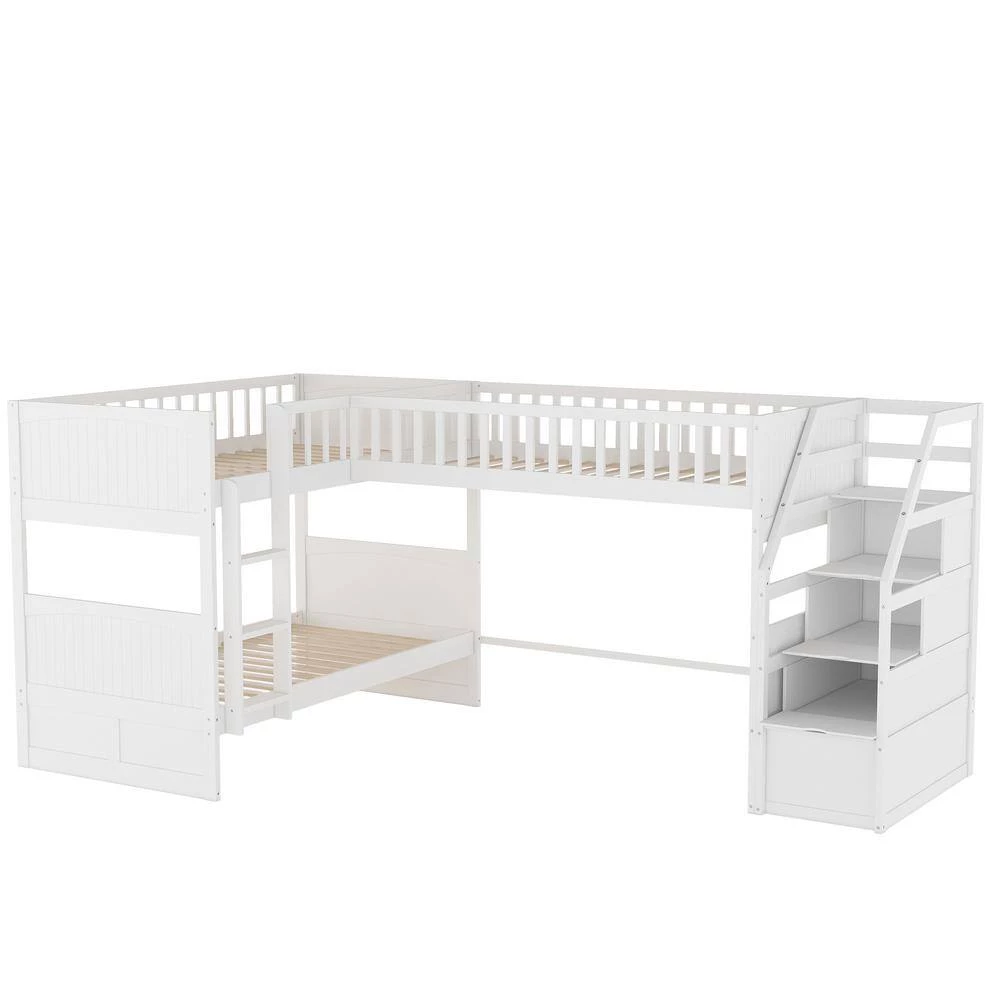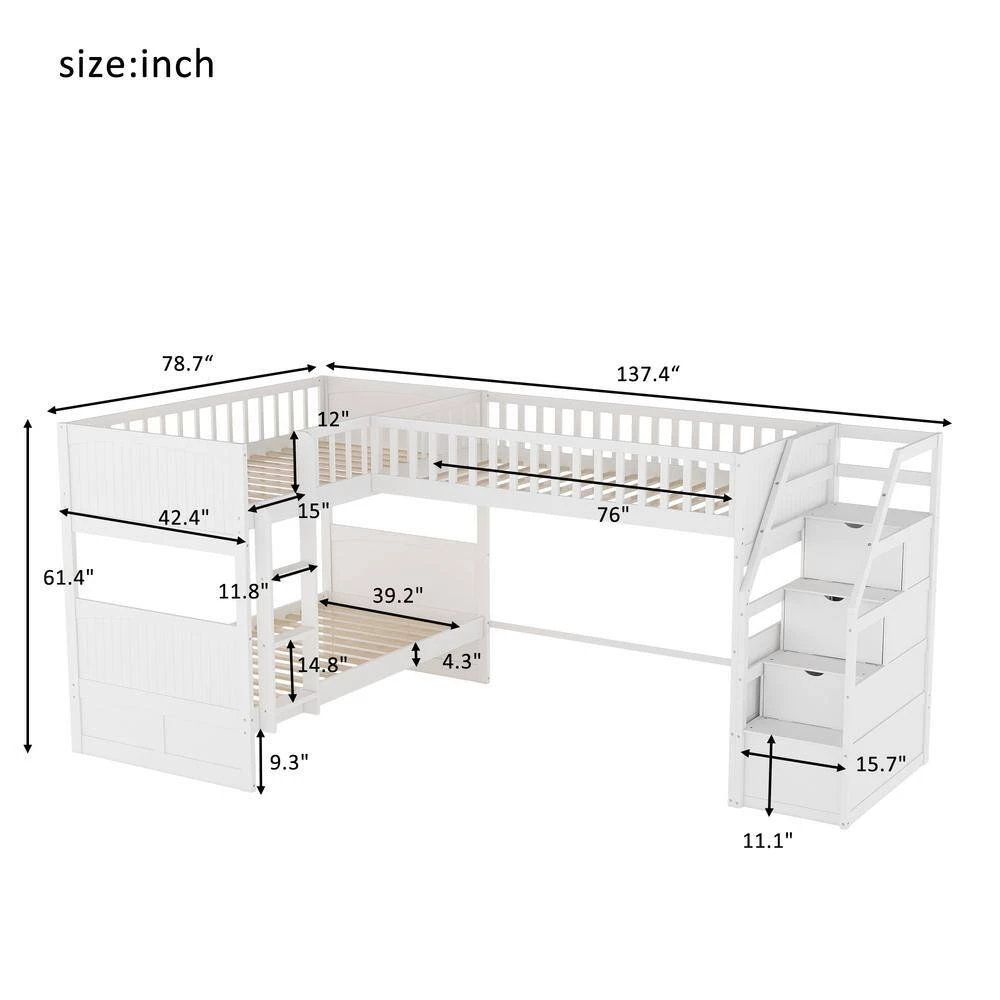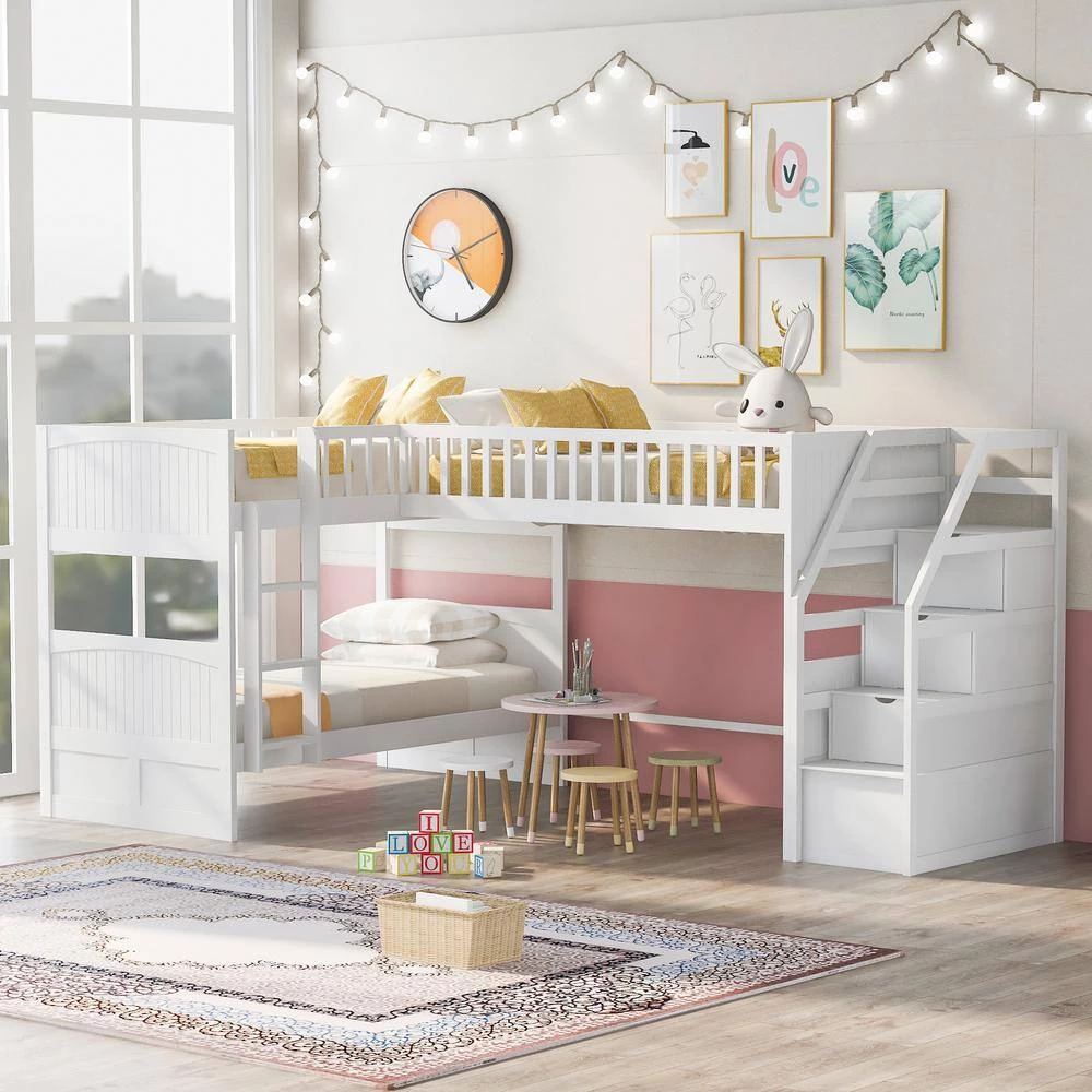 - [Maximized space] This L-shaped bunk bed features 3 beds, a traditional height twin over twin bunk bed, a loft bed and an attached stairway with storage, it could be used for over night friends of yours, perfect for limited space. The space under the loft could be used as play area, or you can also put your dressers or desk to make the best use of your space.