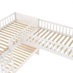 This is a versatile, mission-style L-Shaped bed. Constructed of pine wood and MDF these beds are both stylish and durable. These beds are perfect for your family, sleepovers, or your extra guest sleeping at your lake house getaway. High-quality, solid pine legs and a strong, durable frame ensures stability and durability for long-term use. Slat kit included so box springs are not required. This L-shaped bunk bed and loft bed is designed with a clean silhouette and a hue of elegance. It suits all styles of home decoration and completes the look of any bedroom.