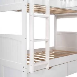 This bed increased sleeping capacity is the perfect solution for cottages, extended family, out-of-town guests, or hosting your rambunctious friends for a sleepover. The triple bunk bed offers space-saving design with two traditional height bunk beds and an attached loft bed, configured to fit in the corner of the room. Two drawers under the bunk. Featuring clean lines, horizontal slats, and built-in stepladders to access the top bunks, the unique bunk bed design offers both durability and functionality. What’s more, the clearance space under the loft bed can be used as a fun area to play with the place or as a versatile spot to set up a little study corner for you!