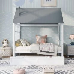 - Roof and windows design, featuring a pitched roof and wall section with window, these house shaped bunk beds create a fun and adorable space that not only serves as a comfortable sleeping area but also double as a space for you to play and have fun